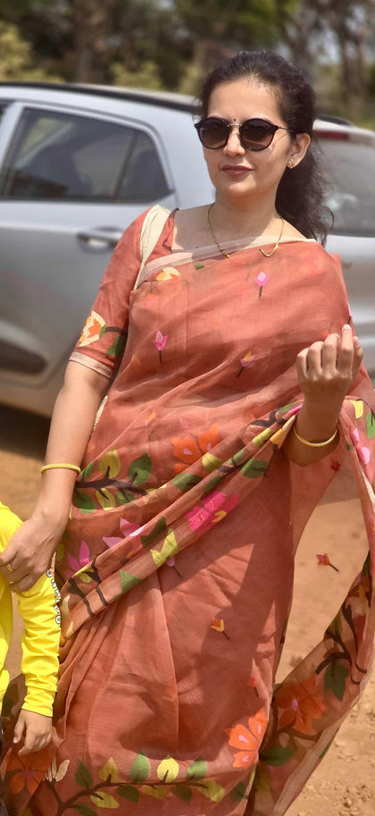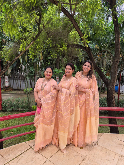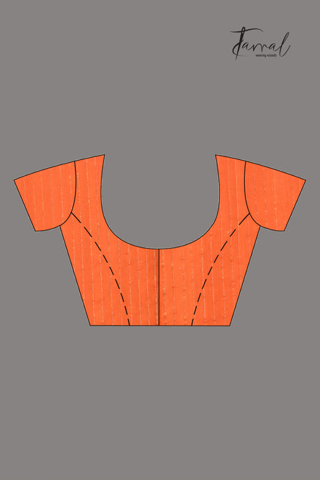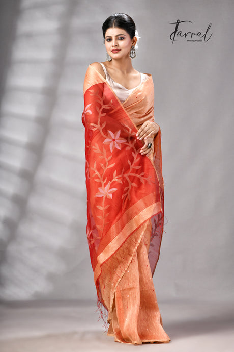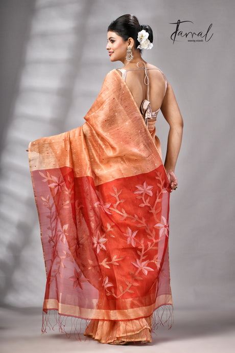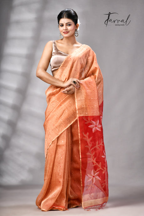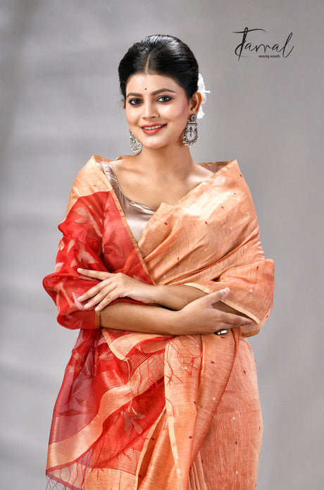 Saffron With Zari Border Silk Linen Handwoven Jamdani Saree