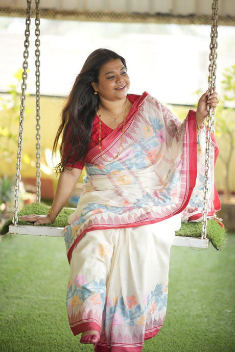 White Muslin Silk Handwoven Jamdani Saree With Kalmilata & Floral Work