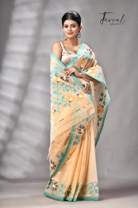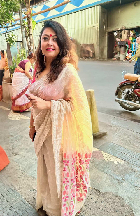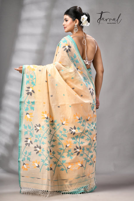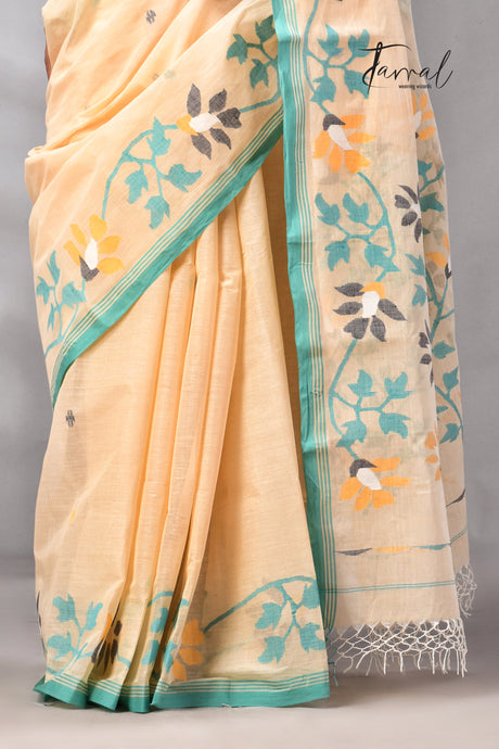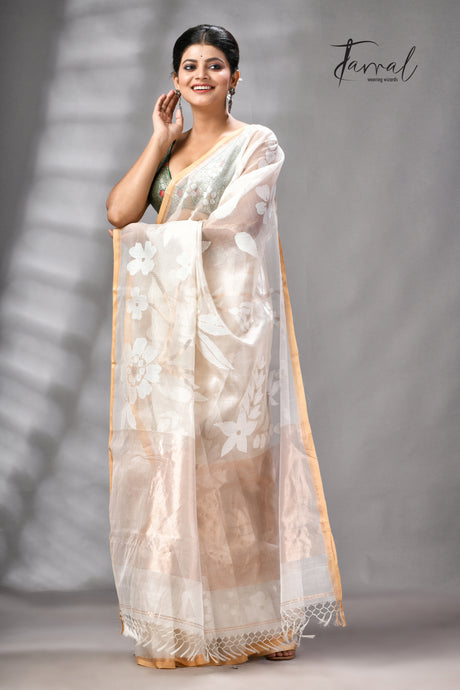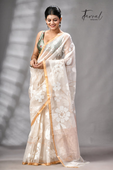 Offwhite With Beige Border Muslin Silk Floral Handwoven Jamdani Saree