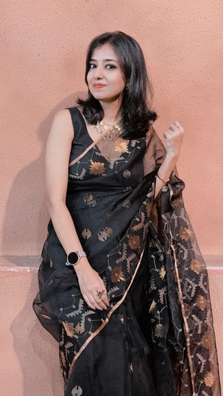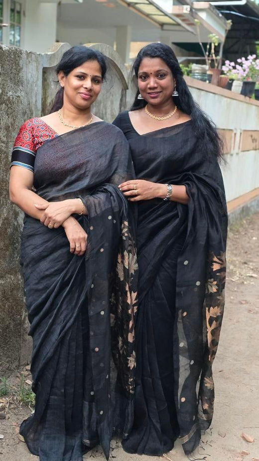 Black pure cotton hibiscus floral handwoven jamdani saree