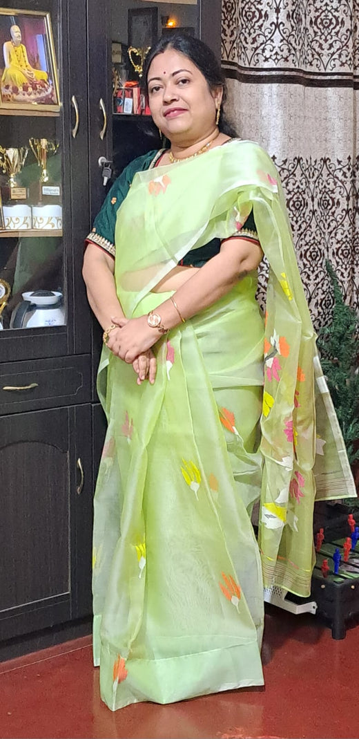 Mint Green Handwoven Jamdani Saree With Multicolor Needlework
