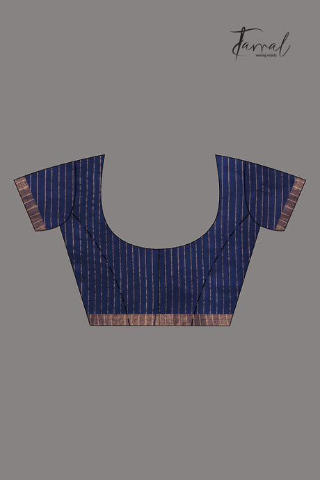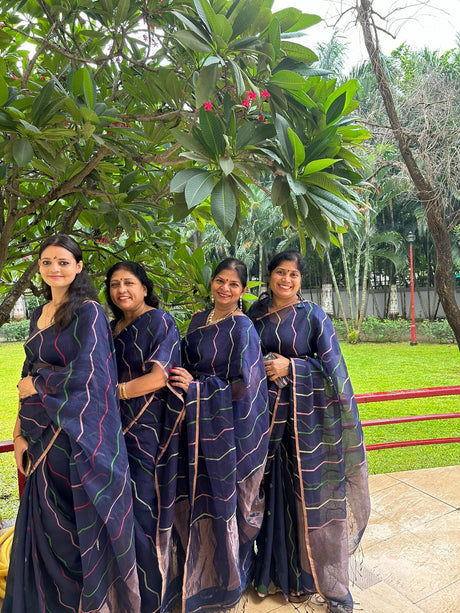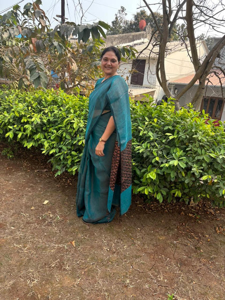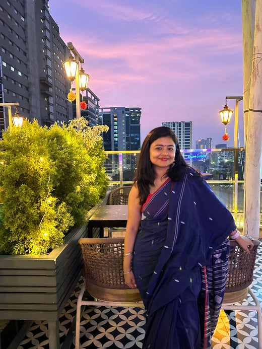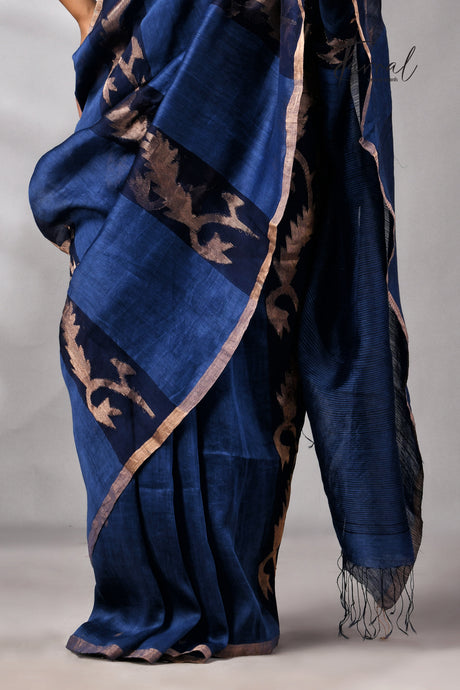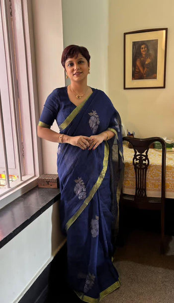 Indigo With Zari Border Pure Silk Linen Handwoven Jamdani Saree
