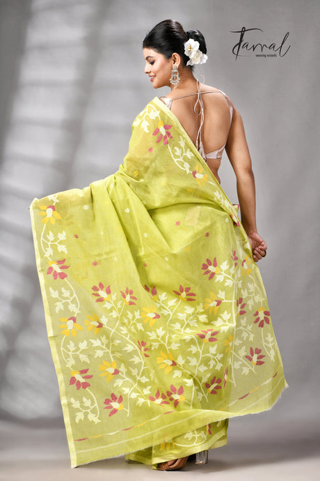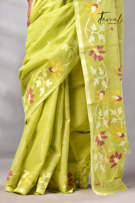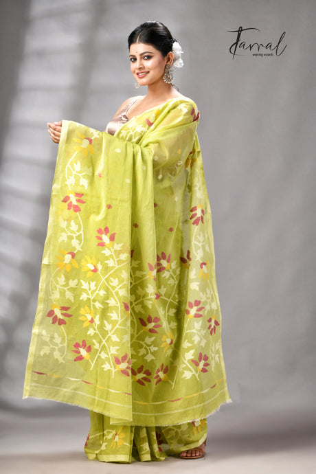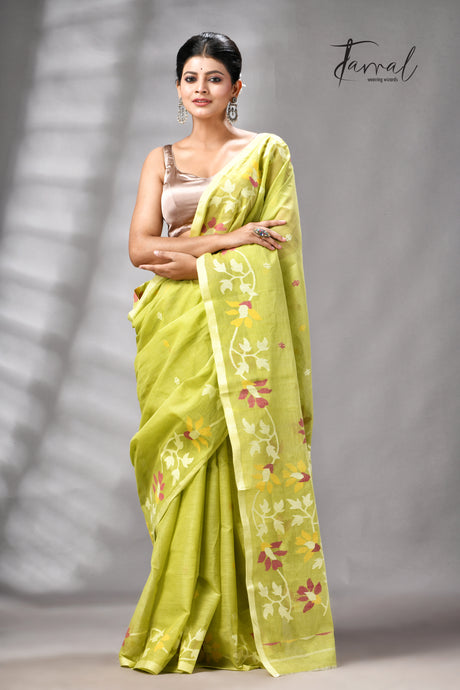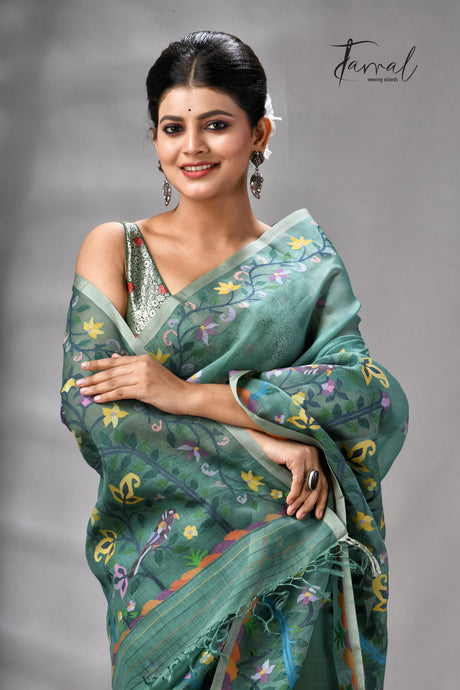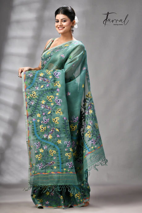 Pine Green Allover Floral With Birds Motifs Handwoven Muslin Silk Jamdani Saree