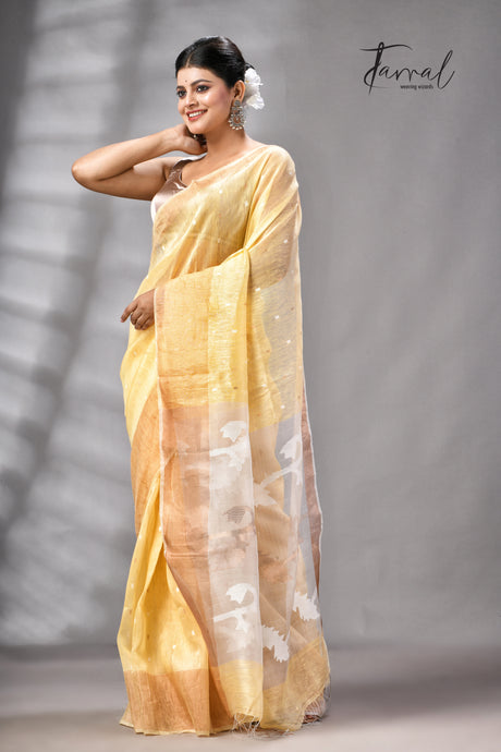 Light Yellow With Zari Border Silk Linen Handwoven Jamdani Saree