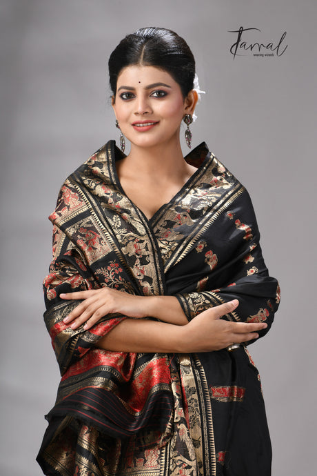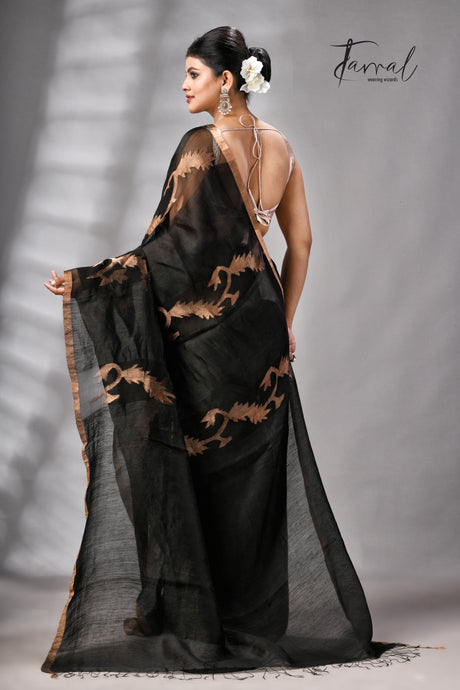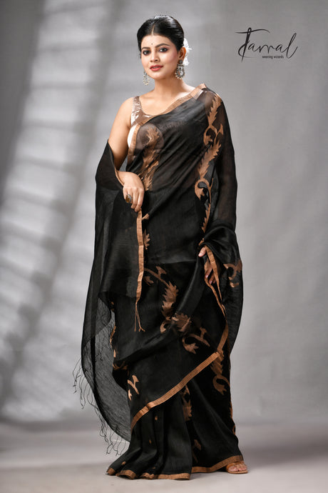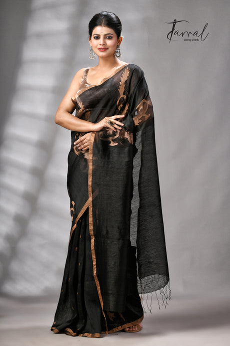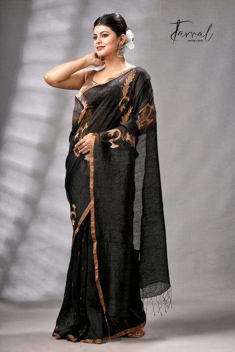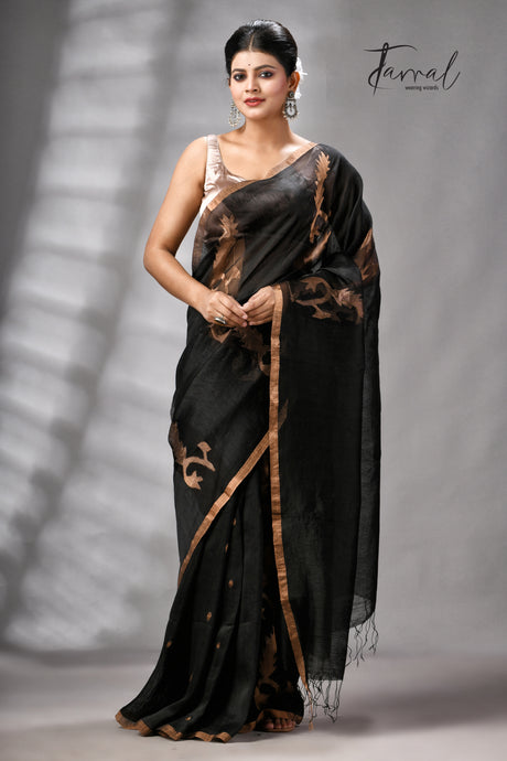 Black in geomatric pattern silk linen handwoven jamdani saree