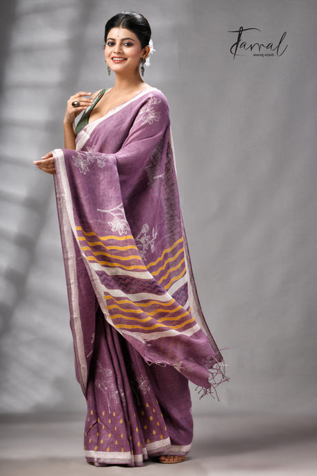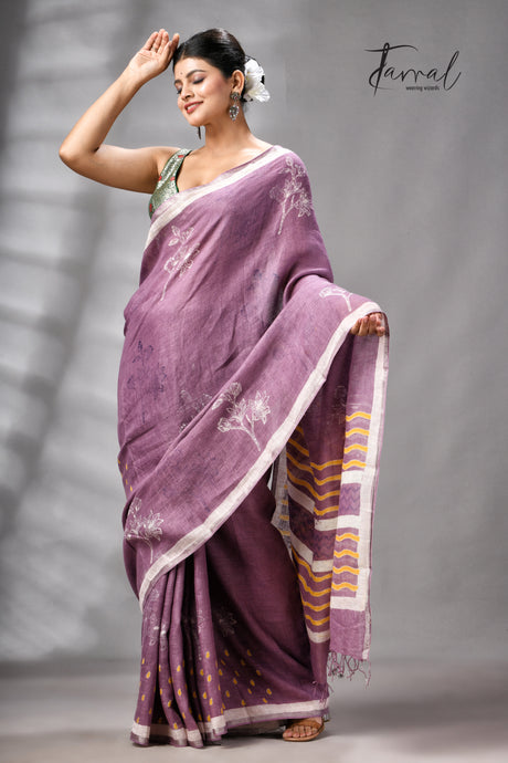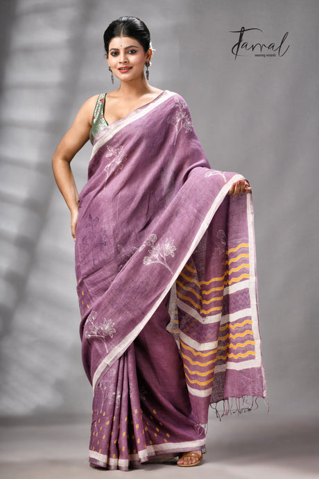 Magenta Colour Pure Linen Hand Block Printed Saree