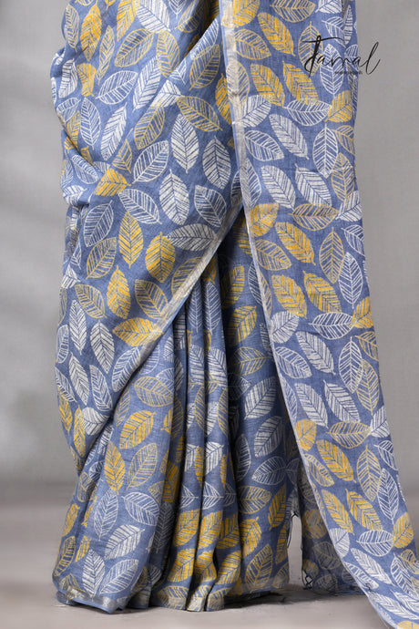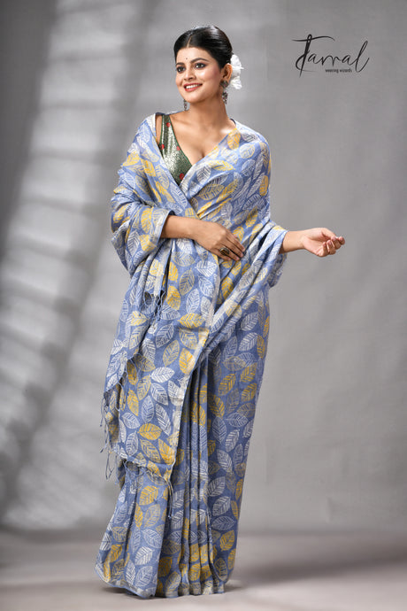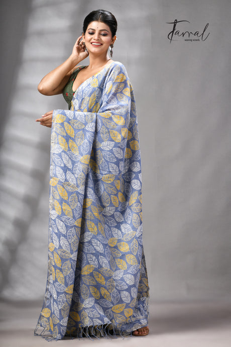 Dust Sky Colour Pure Linen Hand Block Printed Saree