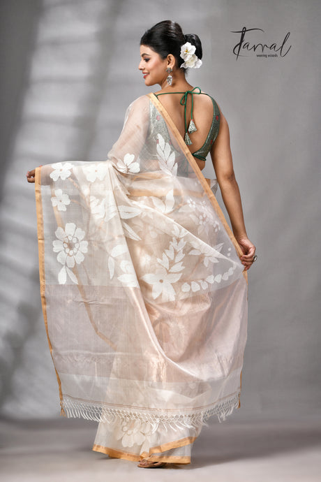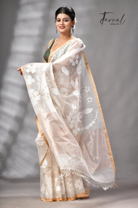 White Gold buds motifs tissue linen handwoven jamdani saree