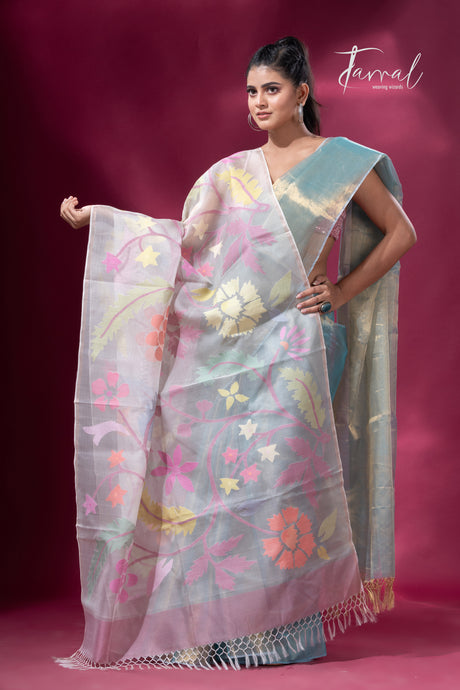 Handwoven Sky Firoza Jamdani Saree in Muslin Silk with Multicolour Floral Motifs