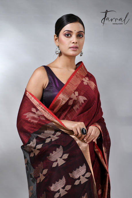Maroon with black star pallu silk linen handwoven jamdani saree