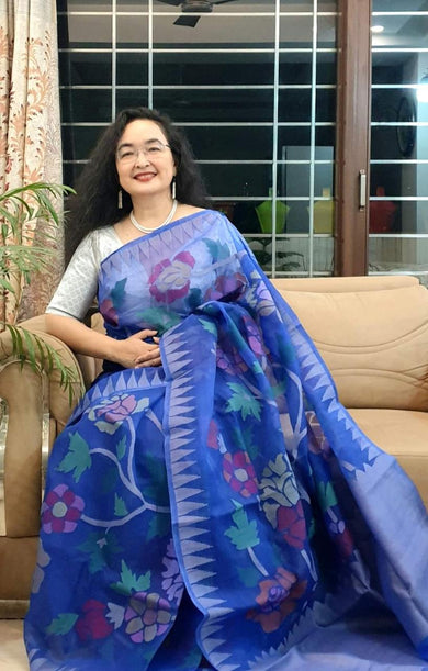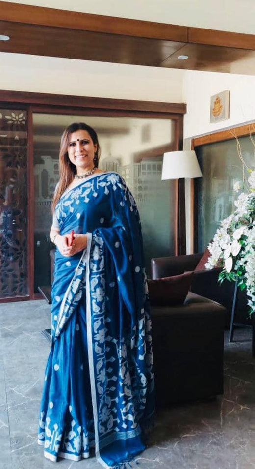Indigo Handwoven Muslin Jamdani Silk Saree With Floral Design