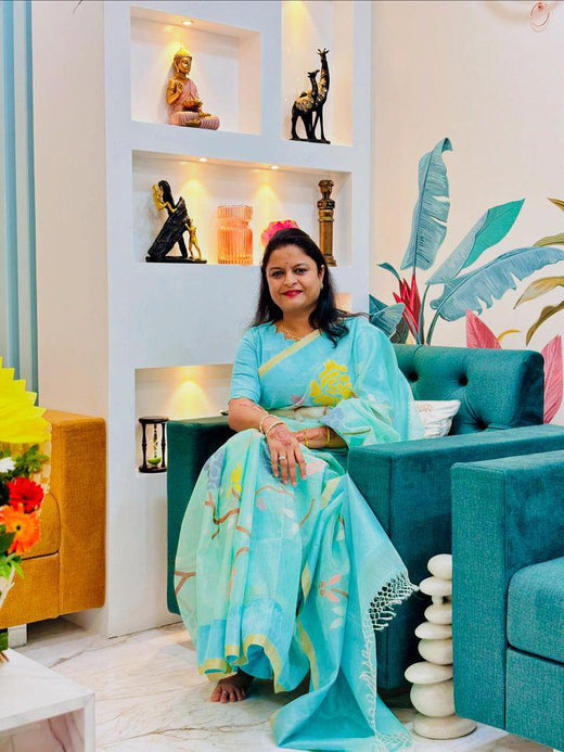 Sky blue with golden zari lotus pallu silk linen handwoven jamdani saree