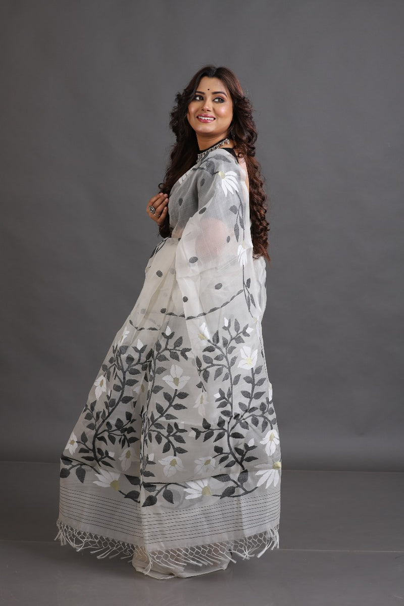 Offwhite Muslin Silk Jamdani Saree With Black & White Floral Design