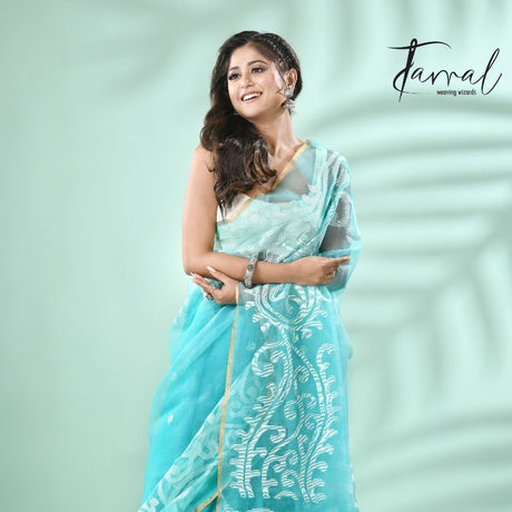 Sky Blue Handwoven Jamdani Saree With Allover White Rose Motifs
