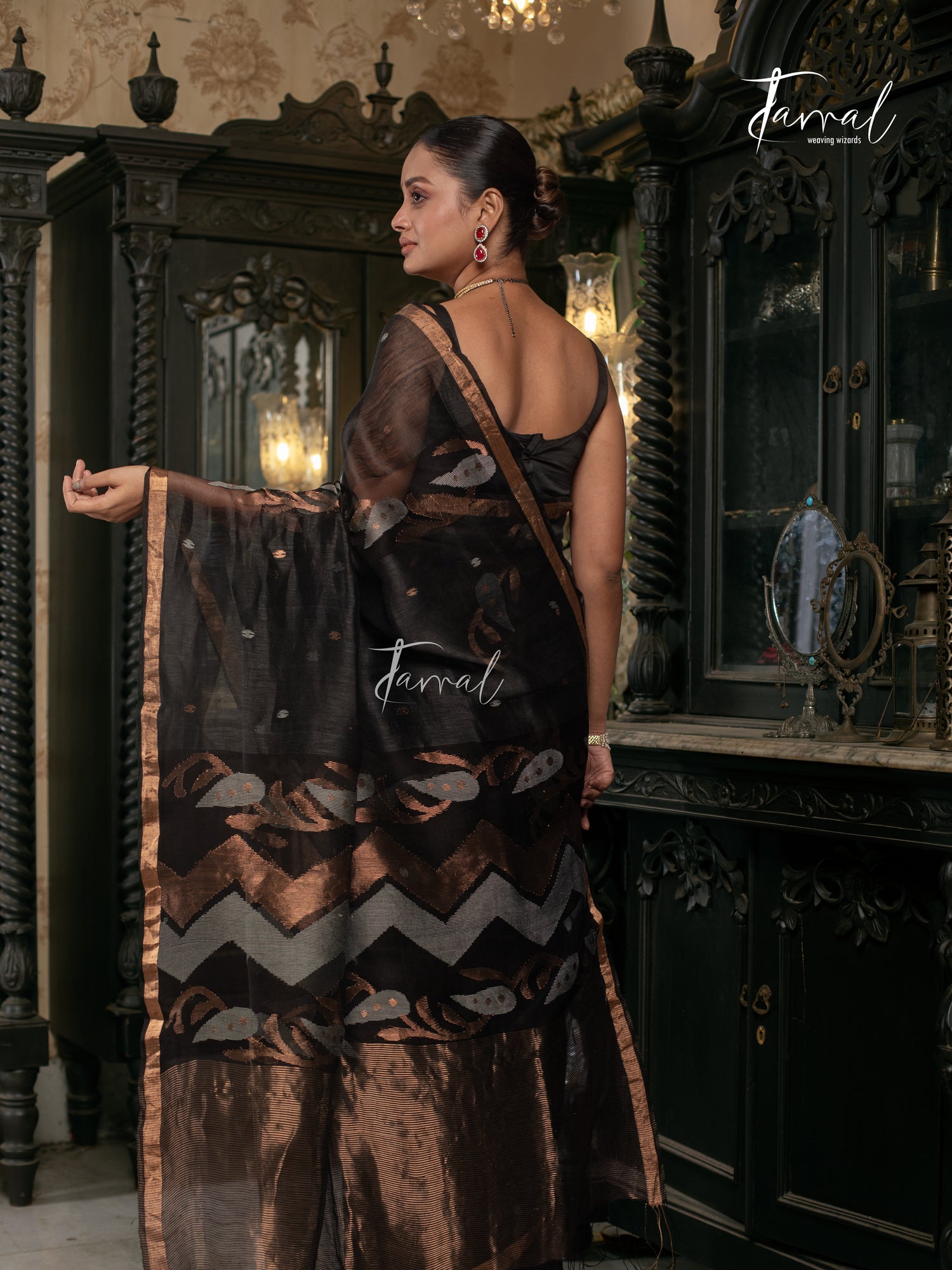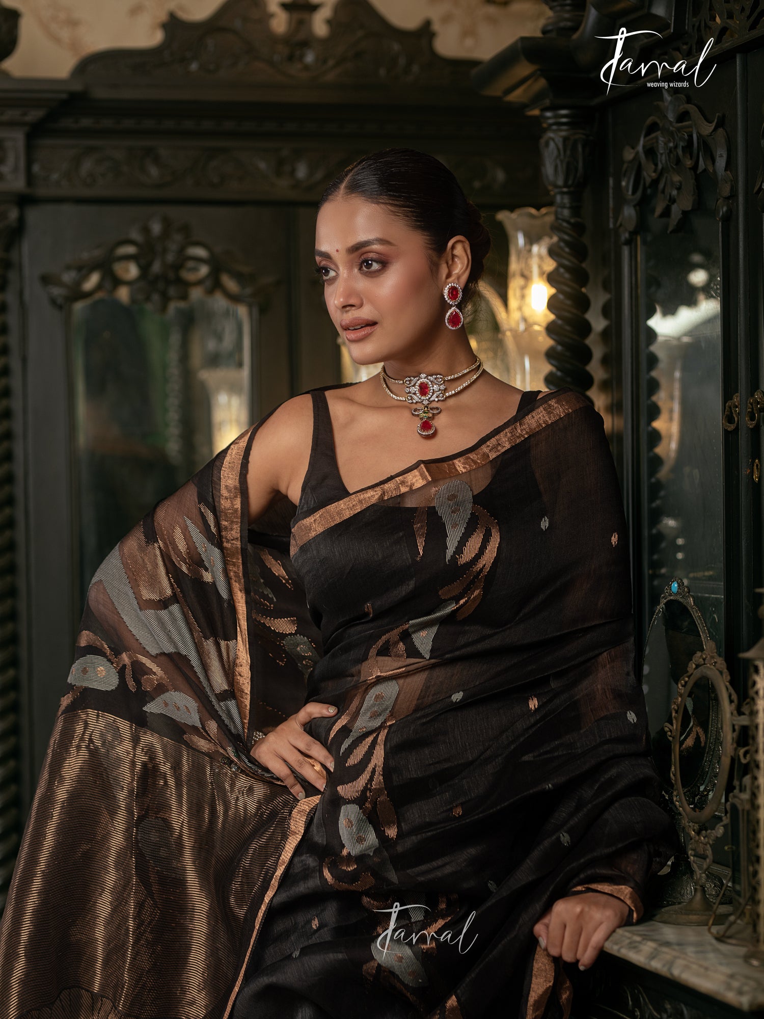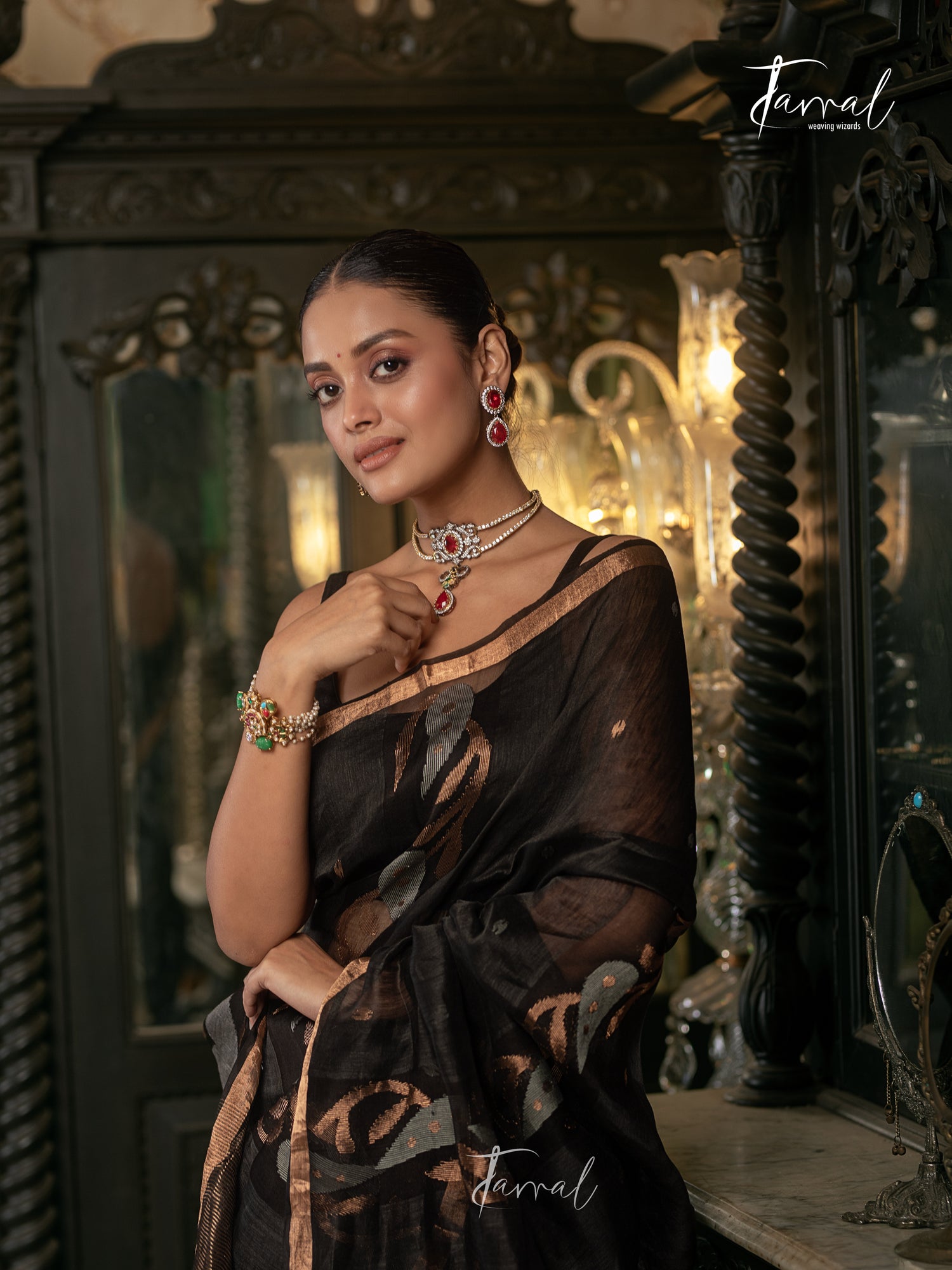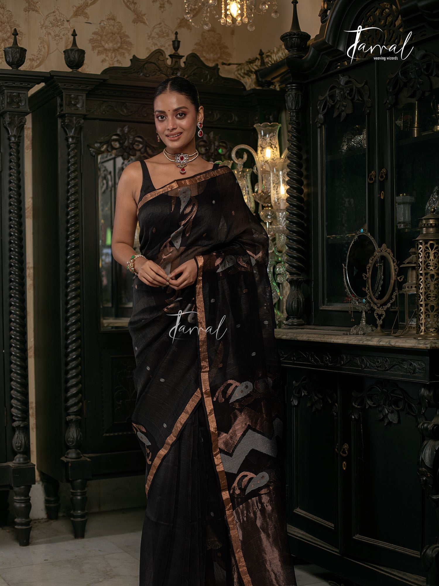 Experience the timeless elegance of the Black Linen Jamdani Saree, a stunning piece crafted from premium Linen Silk. The saree features a bold black base complemented by a luxurious golden zari border, giving it a regal look. Handwoven with the finest craftsmanship, this saree combines the best of traditional Jamdani weaving with modern comfort. Perfect for weddings, festivals, and elegant occasions, this saree adds sophistication to your wardrobe.