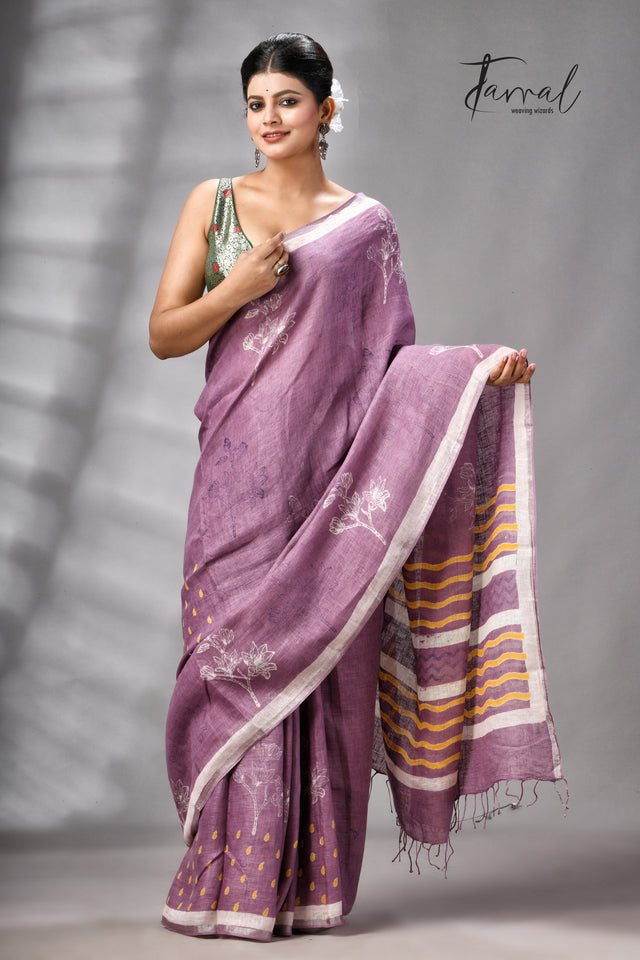 --> Magenta Linen Hand Block Saree in Pure Soft Linen Fabric – Tamal Boutique