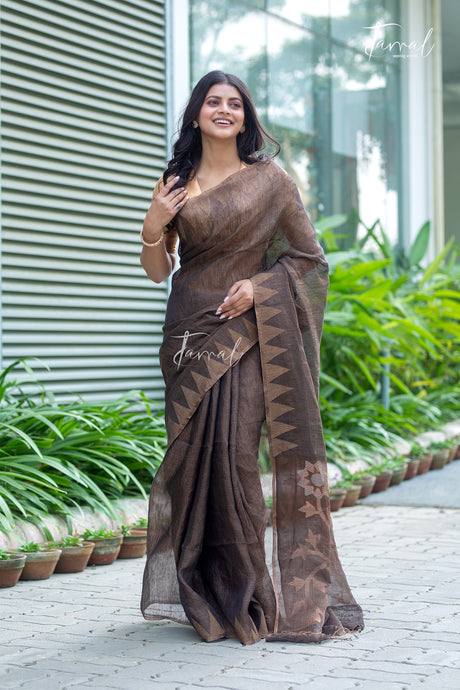 Dusty Rose With Copper Tone Pure Silk Linen Handwoven Jamdani Saree