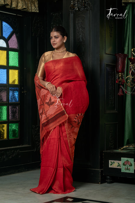 Red With Ghicha Pallu Pure Linen Handwoven Jamdani Saree