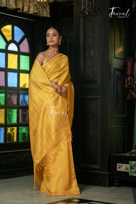 Golden Yellow Colour Pure Tussar Silk Handwoven Jamdani Saree