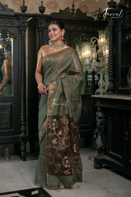 Bottle Green With Golden Border Tissue Linen Handwoven Jamdani Saree