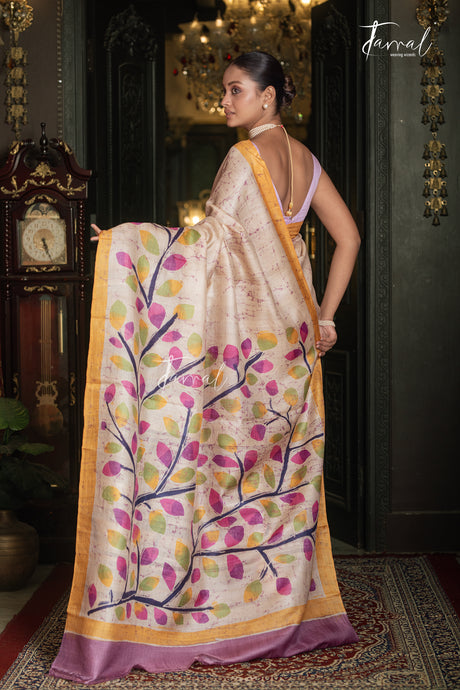 Ivory White With Yellow Border Pure Tussar Silk Handcrafted Wax Batik Saree