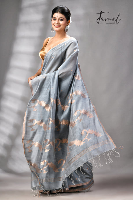Steel Grey Pure Mulberry Silk Handwoven Jamdani Saree