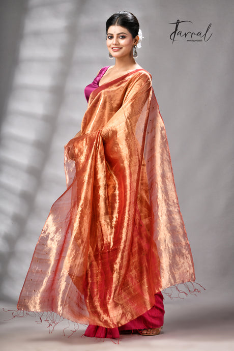 Golden Zari With Rani Colour Half Tissue Sequins & Half Matka Silk Handloom Saree