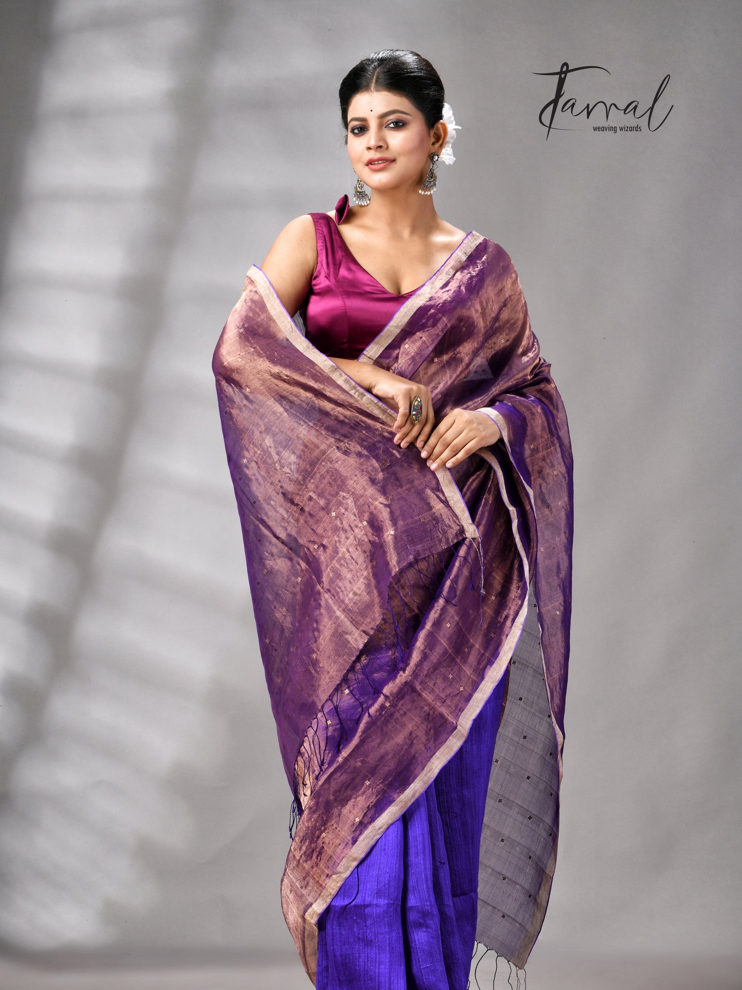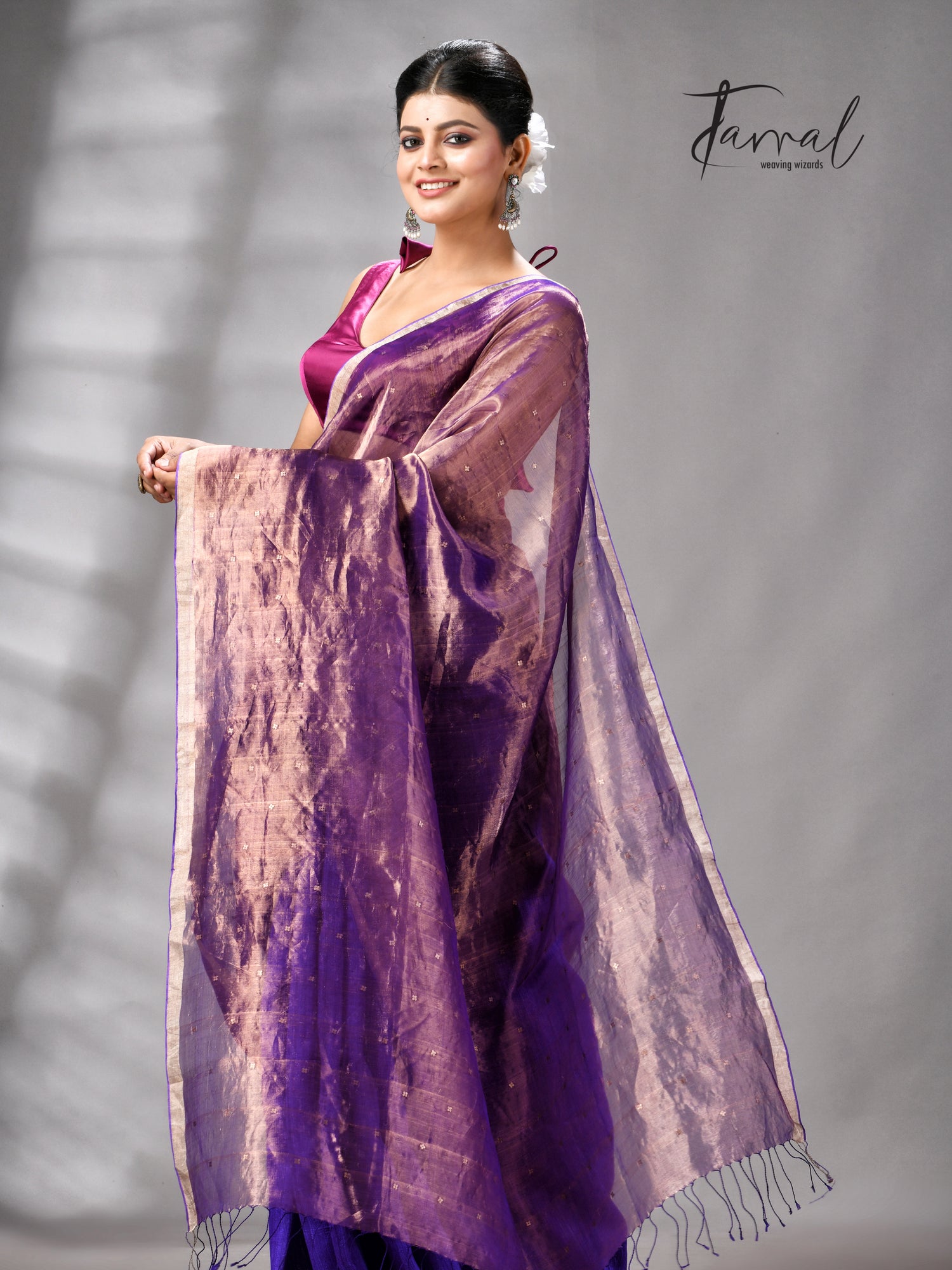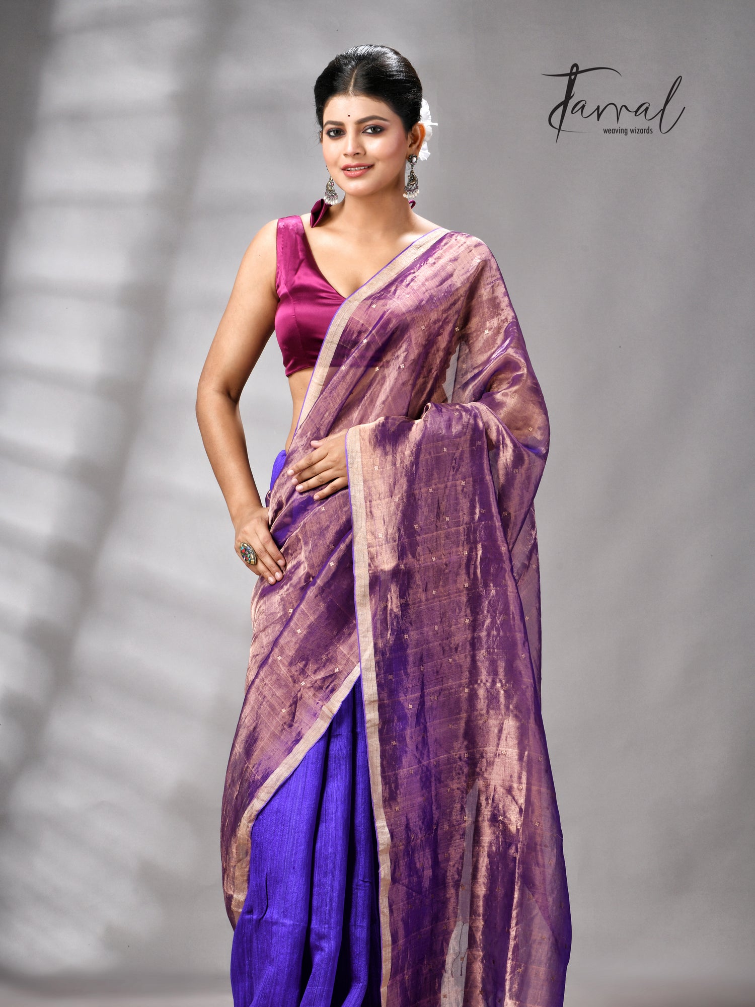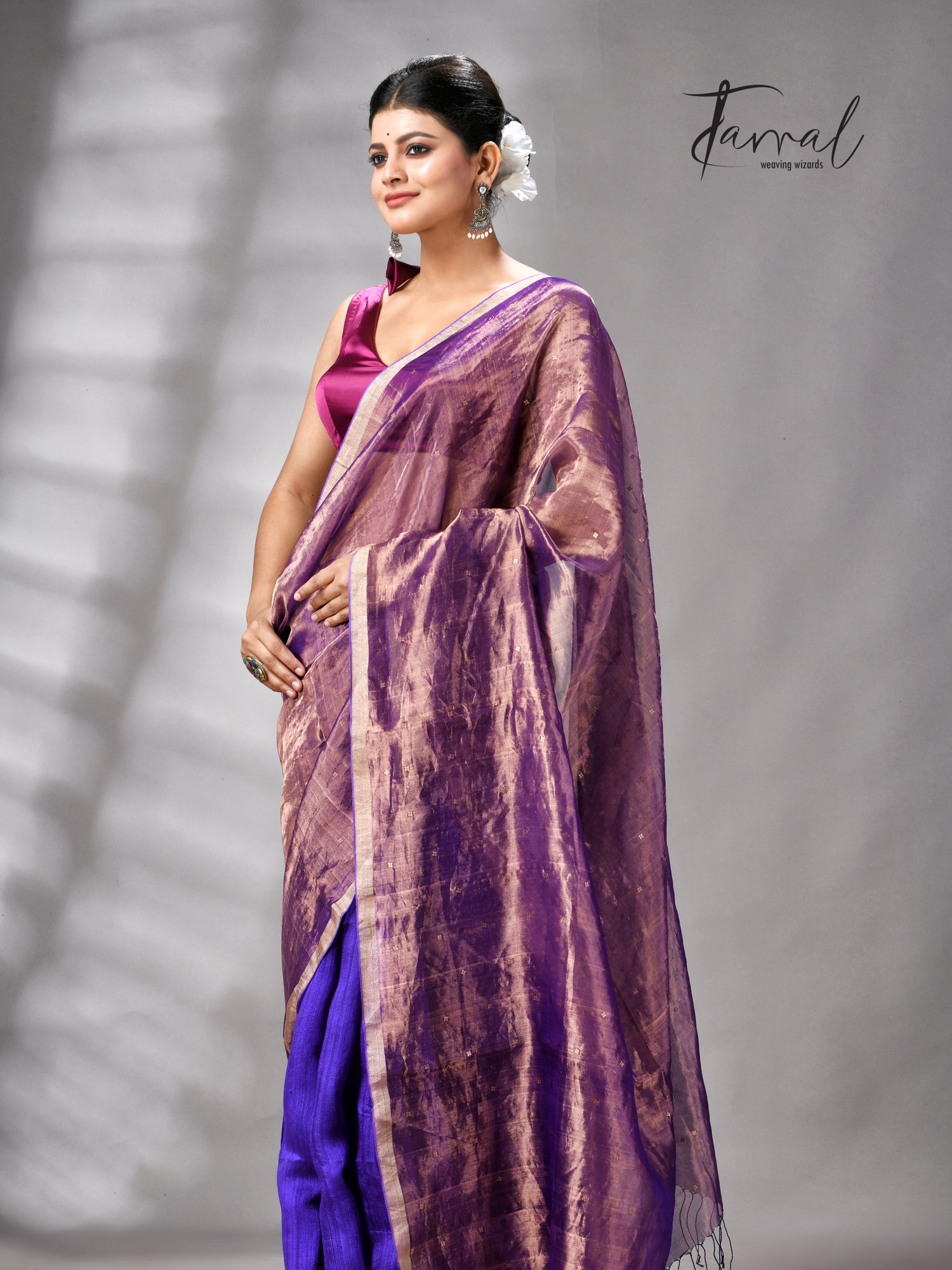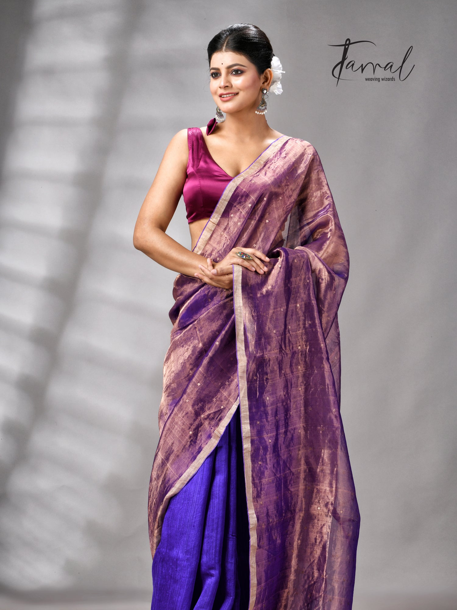 Copper Zari With Purple Colour Half Tissue Sequins & Half Matka Silk Handloom Saree