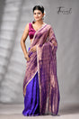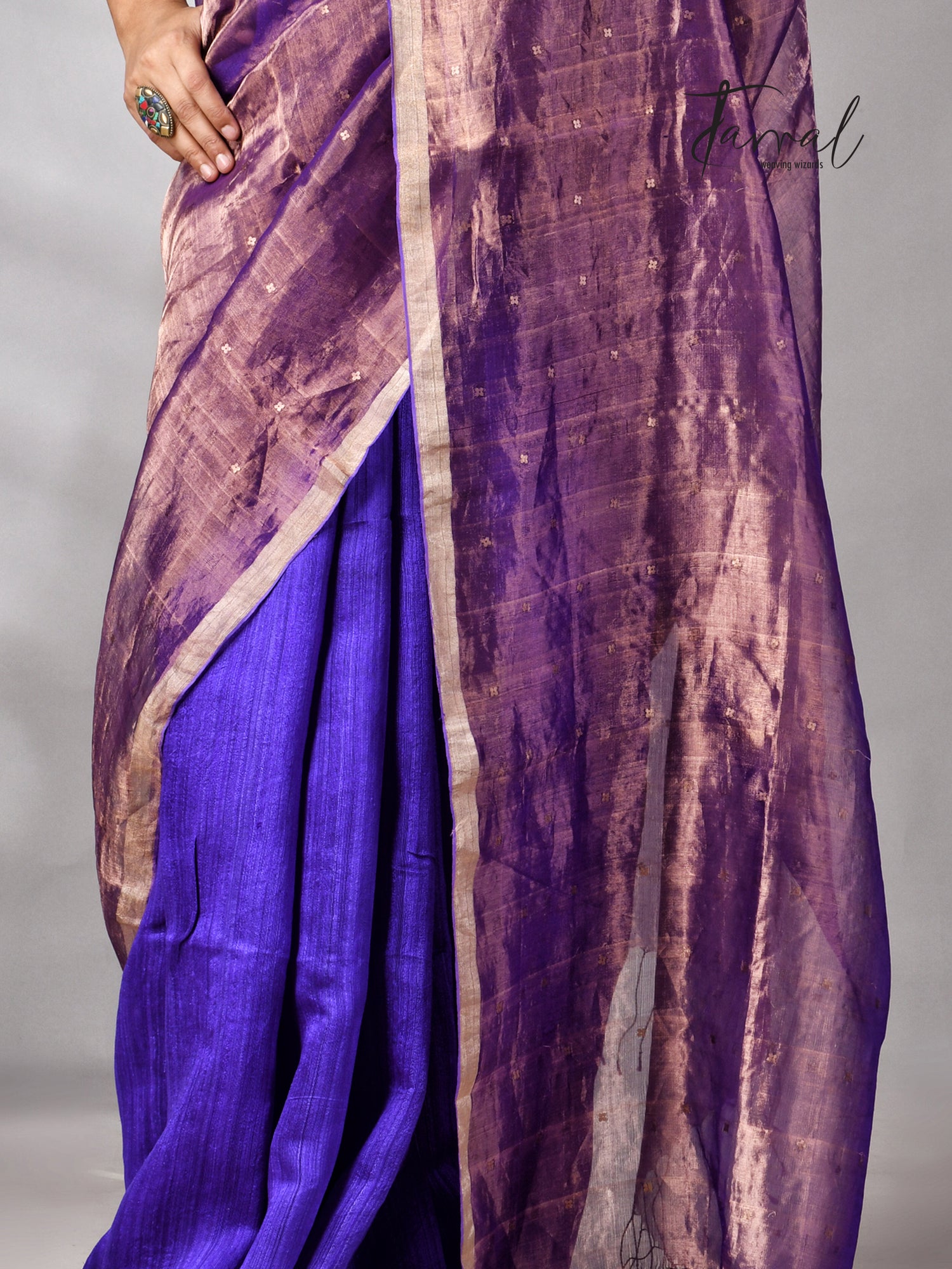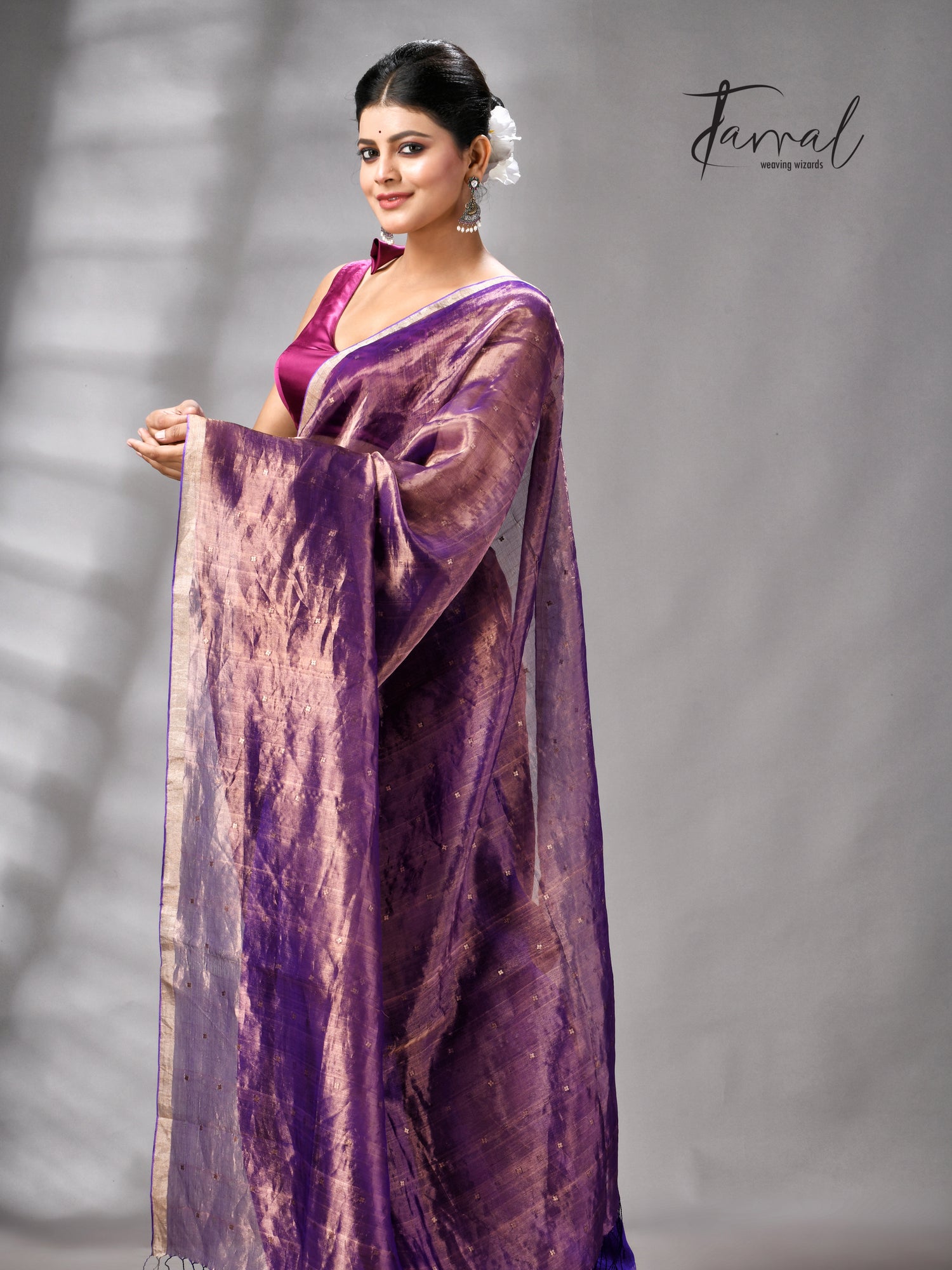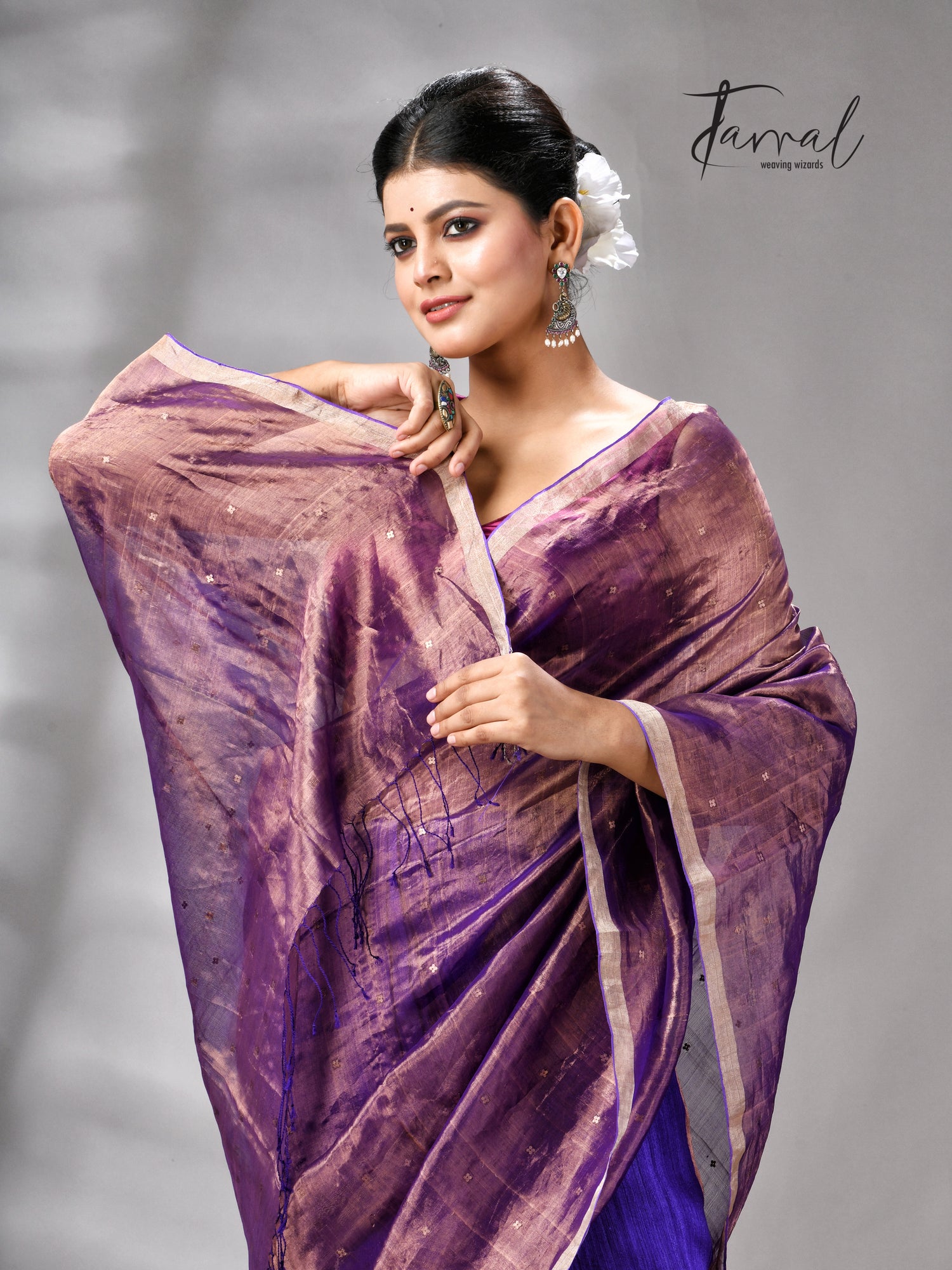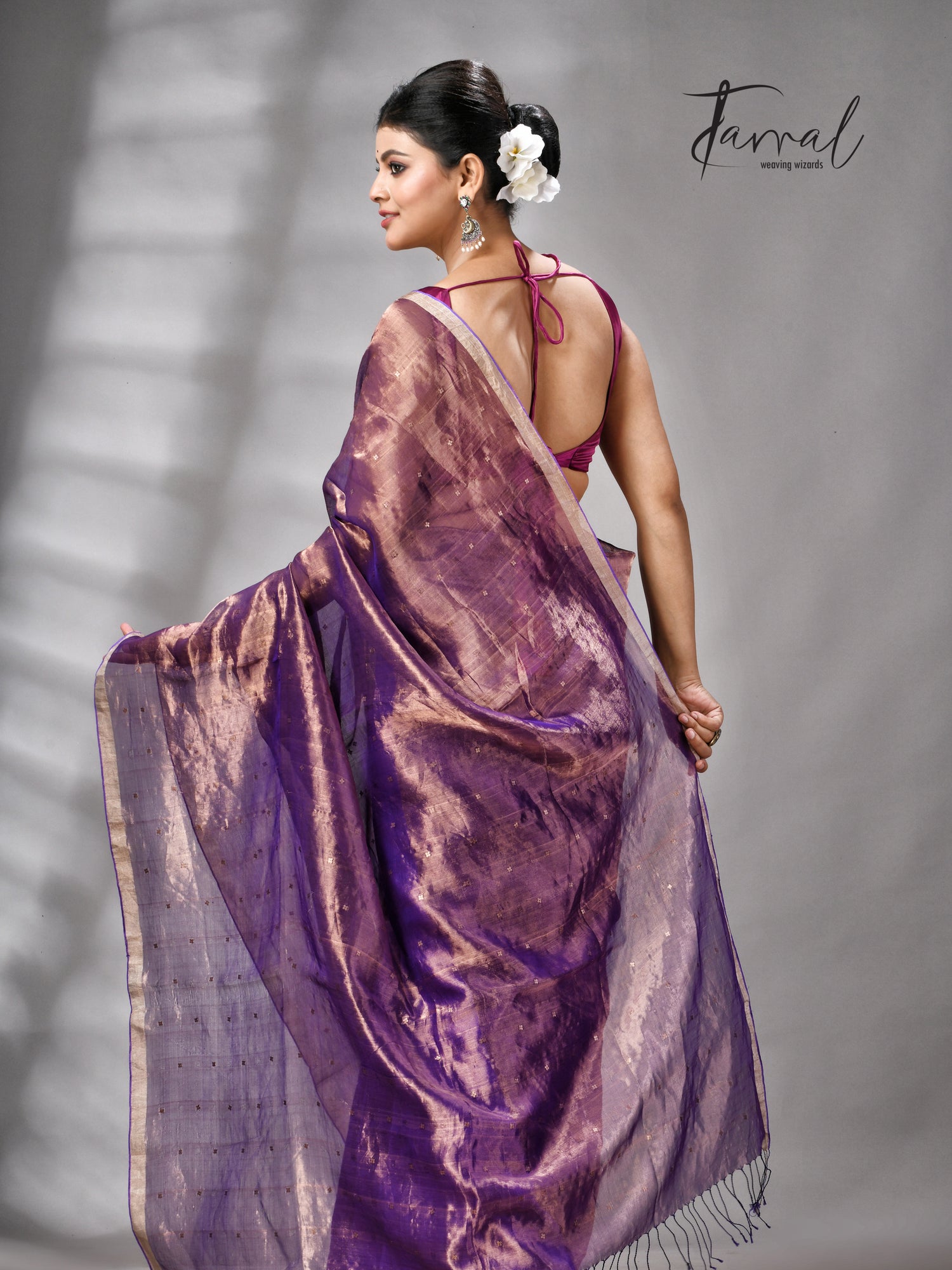 Copper Zari With Purple Colour Half Tissue Sequins & Half Matka Silk Handloom Saree