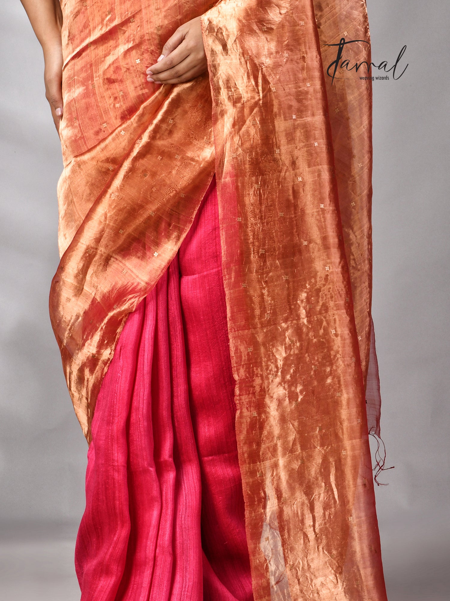 Golden Zari With Rani Colour Half Tissue Sequins & Half Matka Silk Handloom Saree