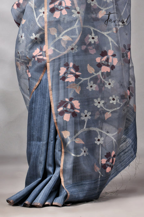 Grey With Silver Zari Work Half Muslin With Half Matka Handwoven Jamdani Saree