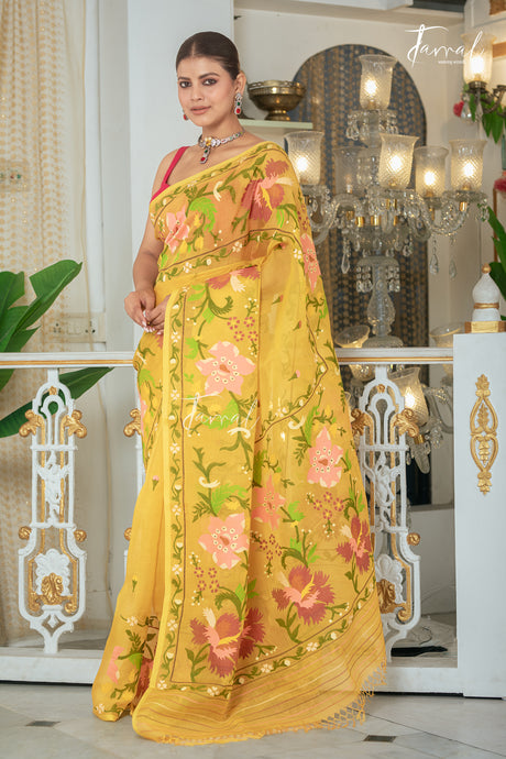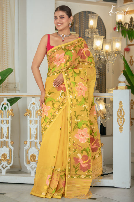 Yellow With Multicolour Allover Floral Handwoven Jamdani Saree